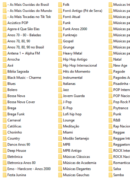 Temos mais de 500GB de músicas disponíveis para download. Lembrando que você pode baixar em partes, por gênero musical ou estilos de cada gênero. Não é necessário baixar todas de uma vez.